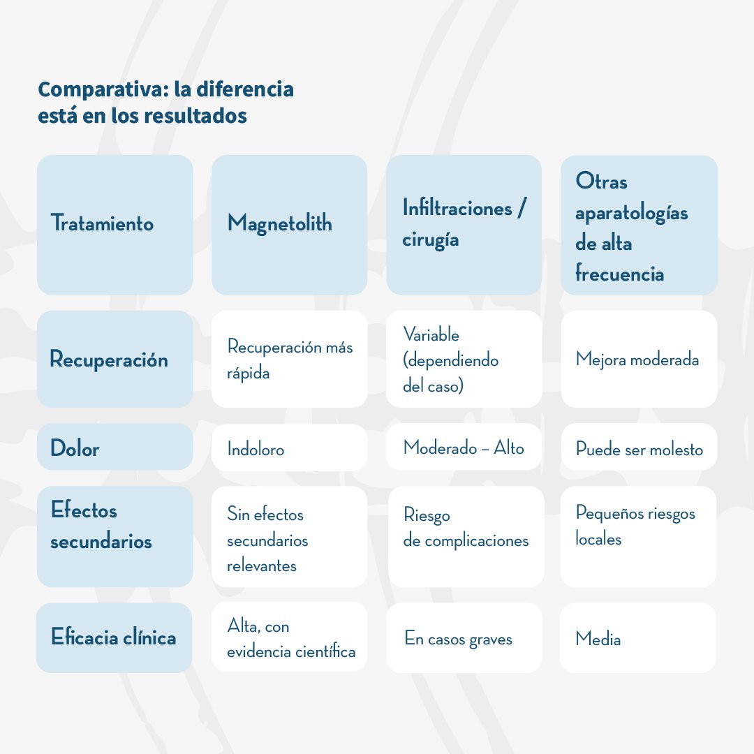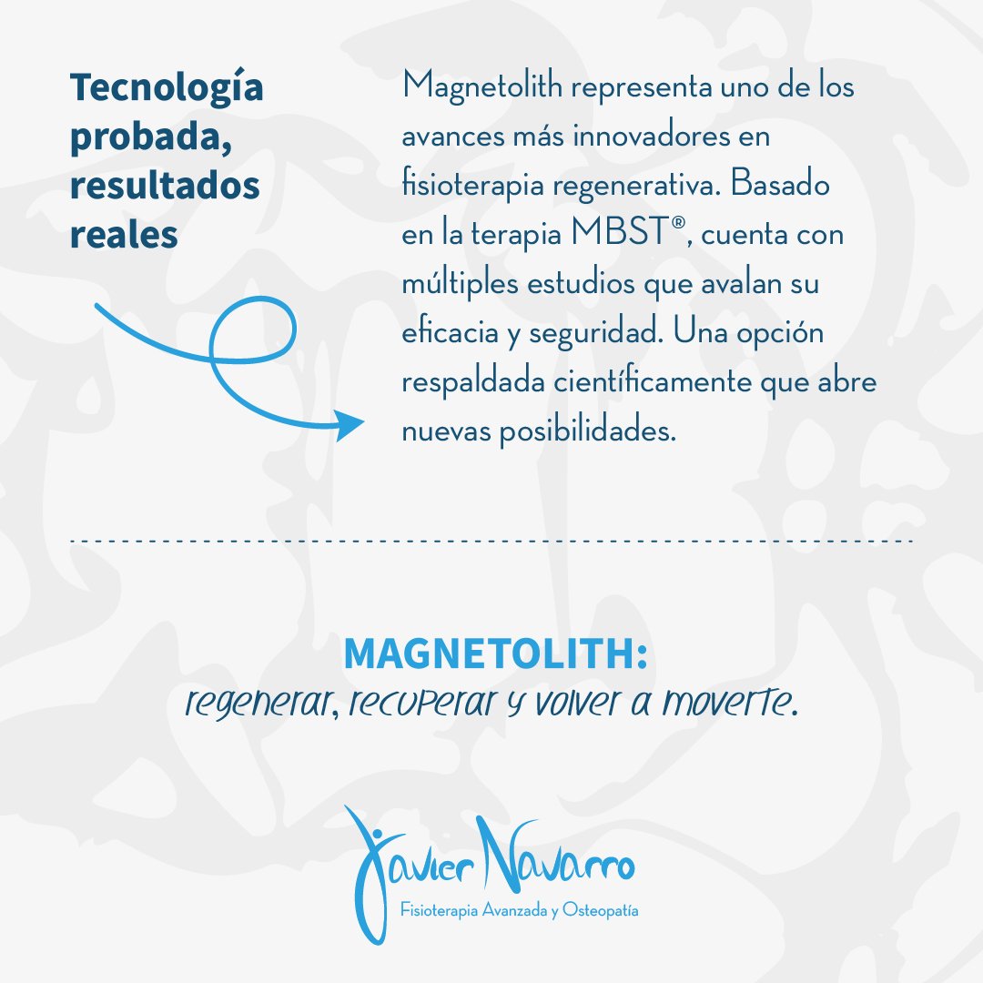 - Fisioterapia avanzada con tecnología de magnetoterapia: una vez que el dolor agudo disminuye, la fisioterapia avanzada es crucial para recuperar la fuerza, la movilidad y la flexibilidad. En la clínica Javier Navarro contamos con Zimmer, tecnología de magnetoterapia de alta intensidad y Magnetolith, dispositivo de magnetoterapia de alta frecuencia.